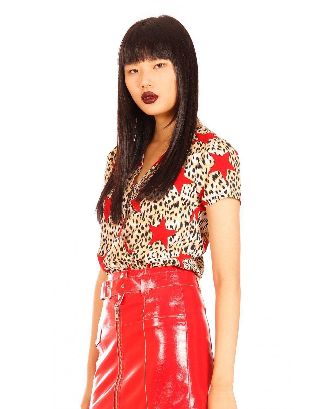 Body with short sleeves. Crossover neck. Back fastening with opening and button.
